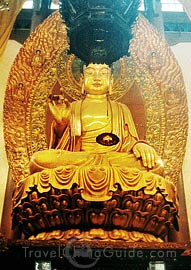 Upon entering the Hall your eyes will be drawn to the delicately painted ceiling decorated with phoenixes and dragons. Images of the Four Heavenly Kings stand upon either side of the Maitreya, a laughing Buddha with a huge belly who is said to be able to 'endure all intolerance and laugh at every laughable person in the world,' as he welcomes those who enter the hall. On passing through this hall and crossing the courtyard beyond, you then enter the Da Xiong Bao Dian. This is the Hall of the Great Hero. It is seven rooms wide, five rooms deep and single storey construction. The double eaved roof soars to a pinnacle of 33.6 metres (110 feet) making it probably the highest single storey buildings to be found in China. The hall houses a statue of Sakyamuni carved from 24 sections of camphor wood with an overall height of 24.8 metres (82 feet). This is one of the largest wooden statues in China and is covered with gold leaf. The statue is flanked on either side by twenty saints. These are said to be protectors of justice. Twelve disciples who serve as guards are seated along the rear wall. The figures are a very imposing and impressionable sight to behold.